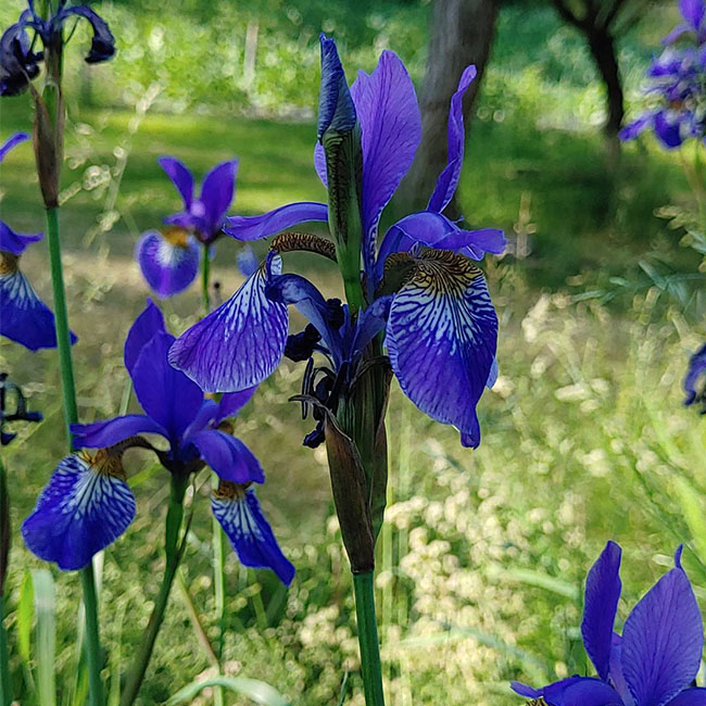 Für die Blaufärbung sorgen unter anderem Eisenhut, sibirische Wieseniris, Hyazinthen, Sumpfschwertlilien, Blausterne, Krokusse und Storchschnäbel.