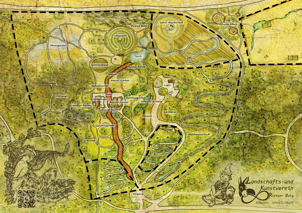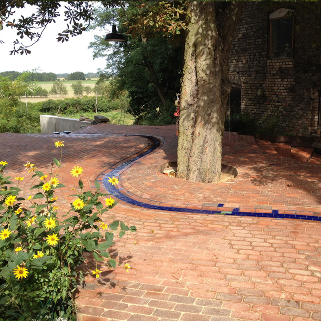 Wenn es auf seinem weiteren Weg den Sonnengarten durchquert hat, wird das Blaue Band vorübergehend in eine feste Rinne geleitet, die über die Terrasse führt, zwischen den Gebäuden entlang und sich in den Pool der Unendlichkeit ergießt. Hier schwappt das Wasser über den Rand, bewässert die Grüne Wand und führt an deren Fuß weiter hinunter in Richtung des geplanten Teiches im Norden des Geländes.