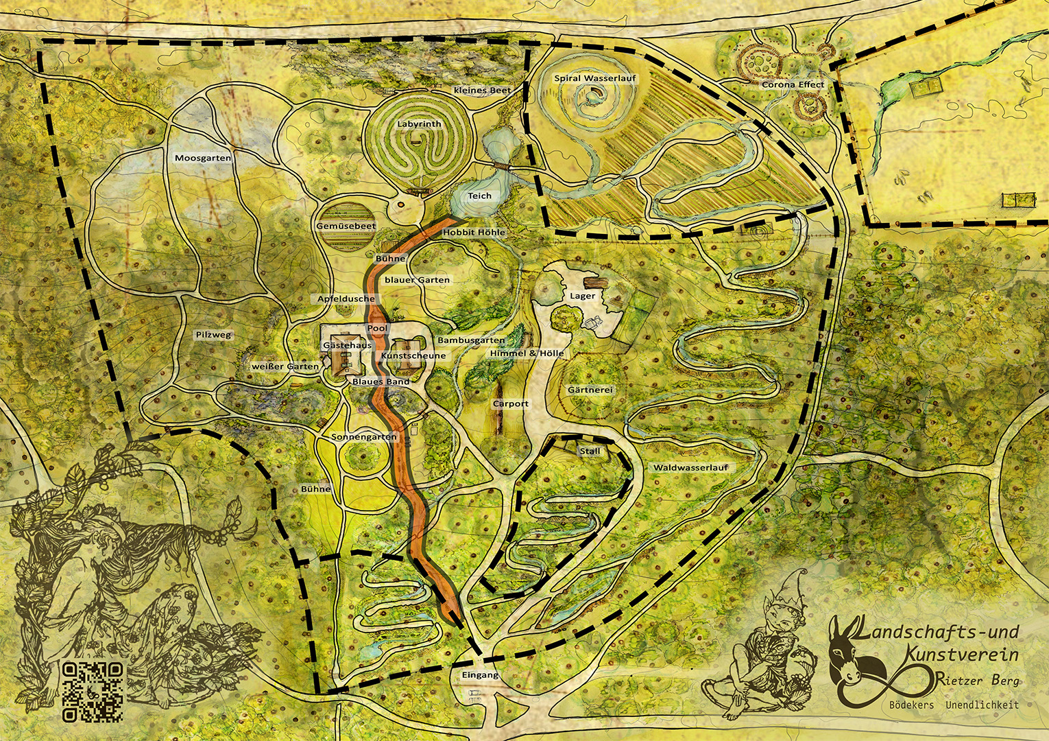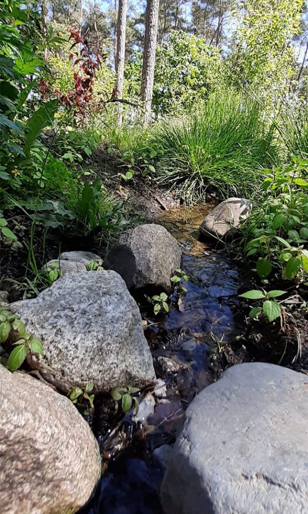 Er entspringt im Wald und sein Verlauf ist nicht festgelegt, sondern darf sich verändern. So schlängelt es sich von seinem kleinen Quellbecken ausgehend, das von sumpfigem Gelände mit saurem Boden umgeben ist, durch den Wald hinab. An seinem Lauf wachsen Minze und säureliebende Moorbeetpflanzen.