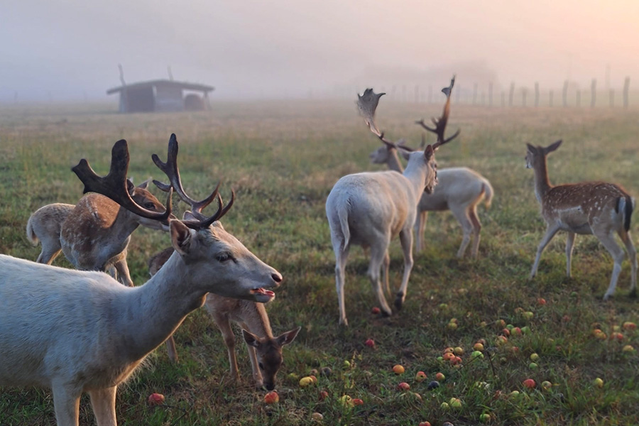Der Rudelführer ist der weiße Damhirsch Hubertus Leopold vom Rietzer Berg mit seinem für einen Damhirsch typischen schaufelförmigen Geweih. Damwild erkennt man, im Gegensatz zu Rotwild oder Rehen, übrigens an den weißen Punkten im Fell, welche im Sommer besser als im Winter hervortreten. Im Herbst ist Brunftzeit, in der die Männchen ihre Brunftschreie hören lassen und miteinander um die Weibchen kämpfen. Im Frühjahr des Folgejahres werden dann die Jungen geboren.