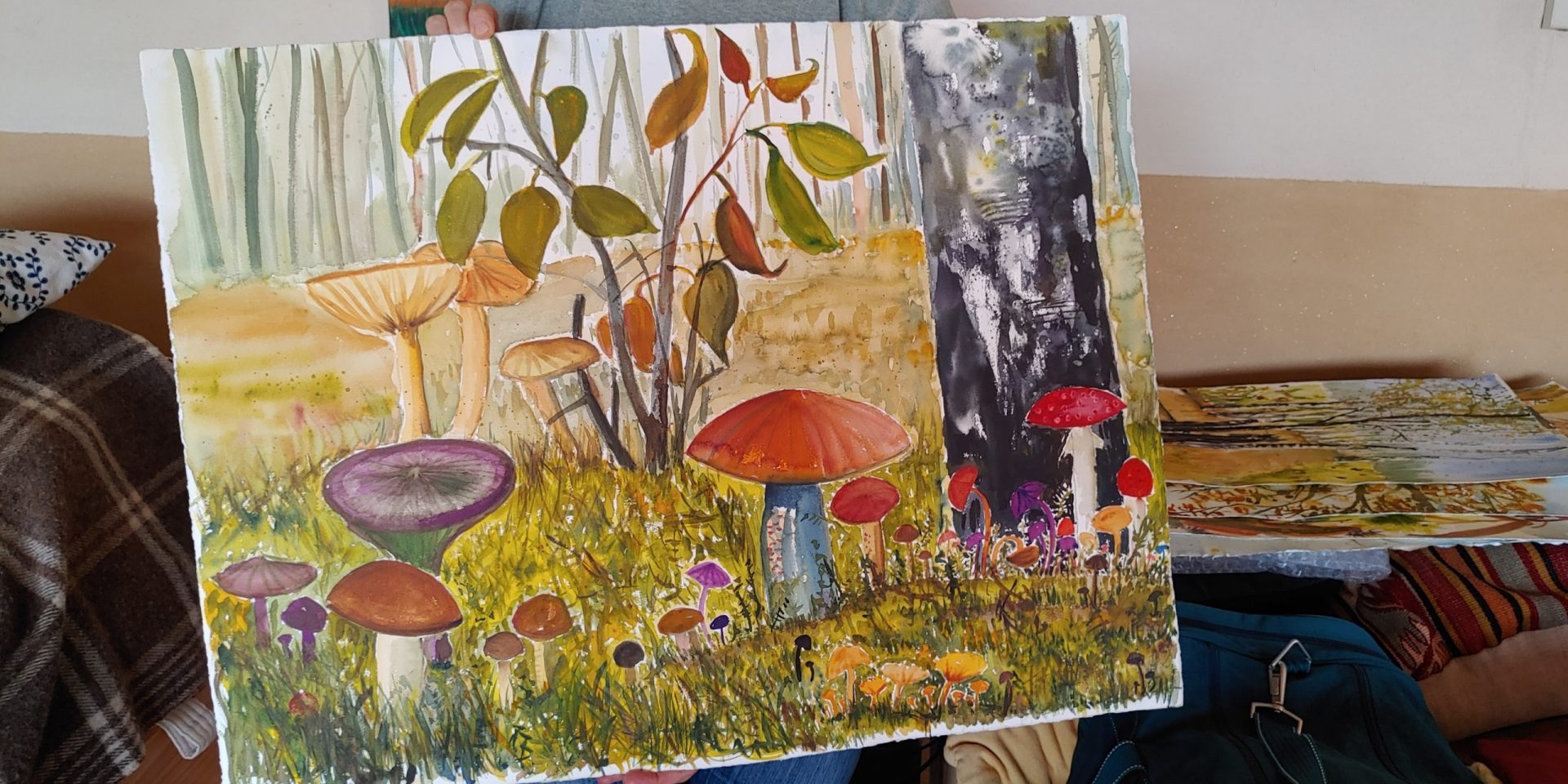 The autumn landscape and mushrooms played a major role for artist Astrid Homuth of Leipzig. The mushrooms were both painted and eaten. In the beginning of her stay, Astrid drifted about in the quiet and solitude of the surroundings, but created some structure for herself after a couple of days. She read a lot, tried different things, took photos and drew. But certainly there was also enough time to explore the surroundings and collect mushrooms.