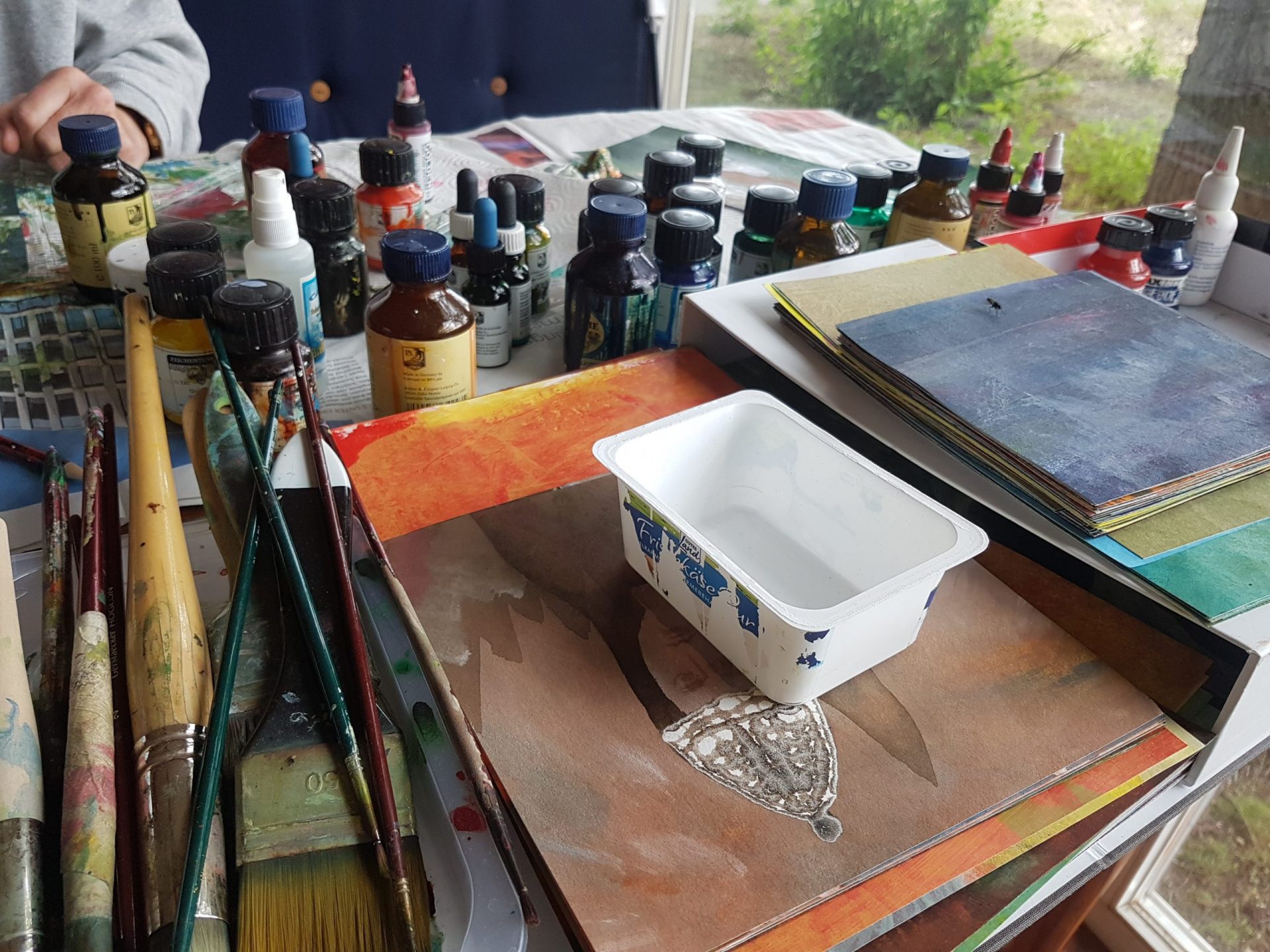 She mostly uses wet-in-wet watercolors and acrylic paint so that the colors react with and blend into each other. That gives the paintings a slightly blurred and therefore atmospheric touch. Gabriele likes to use both paintbrushes as well as Chinese bamboo quills for her paintings.