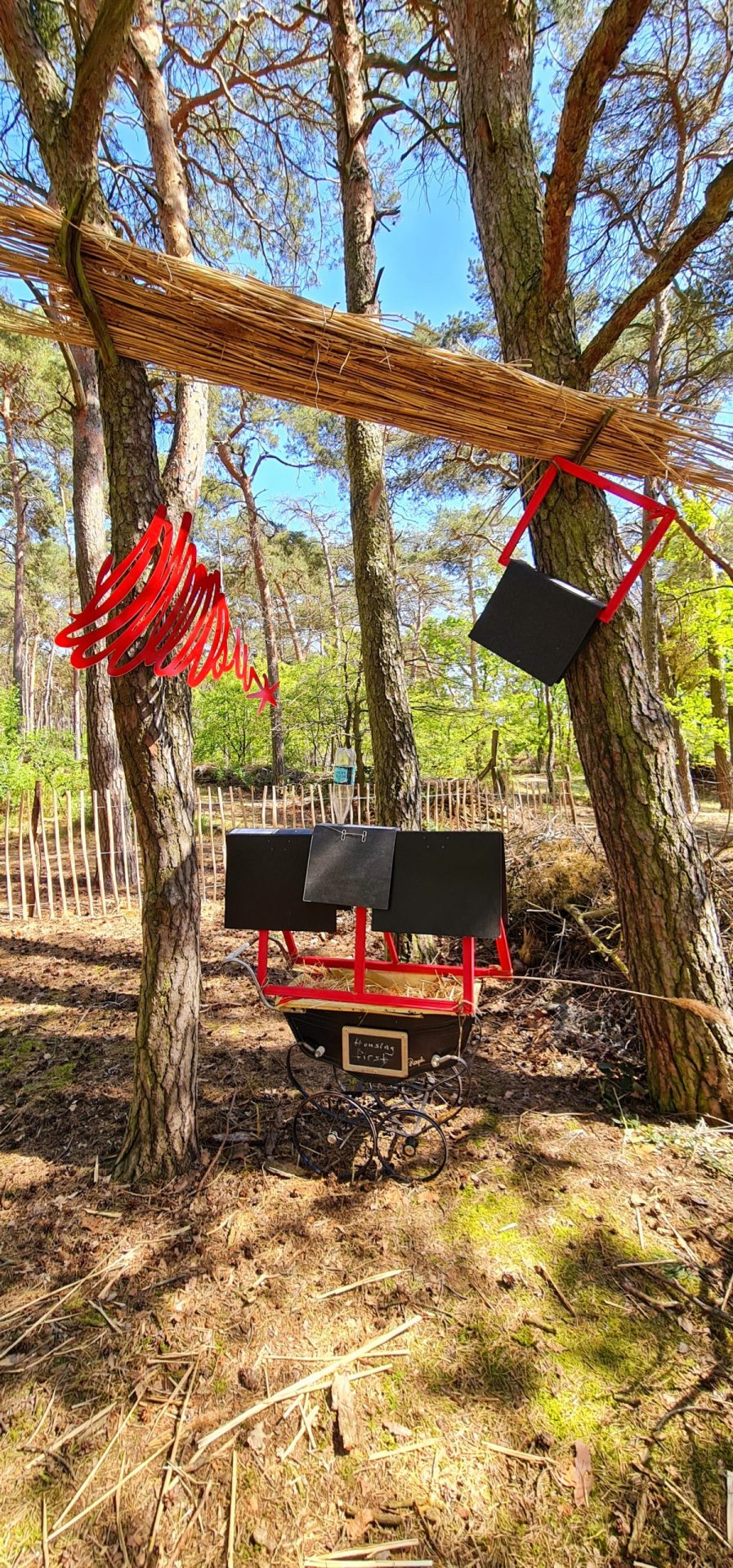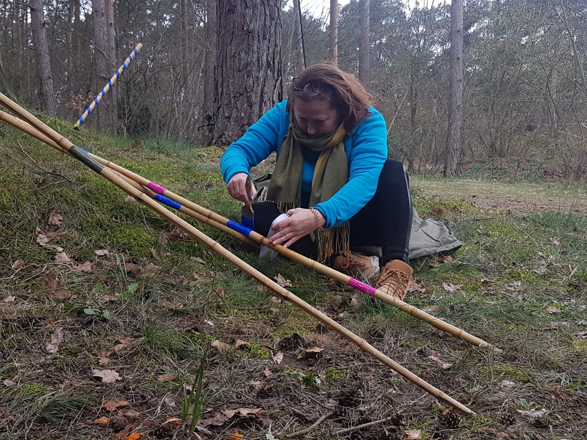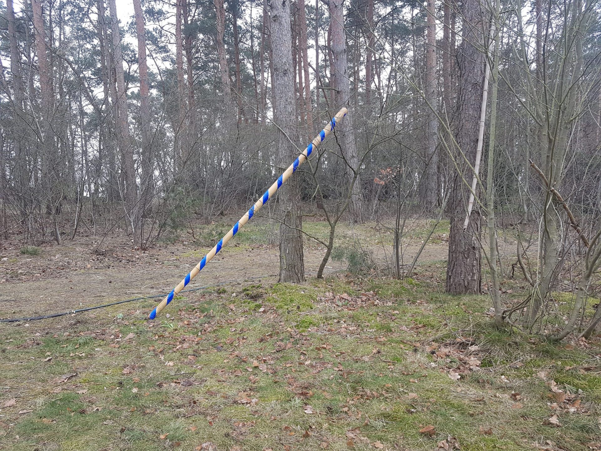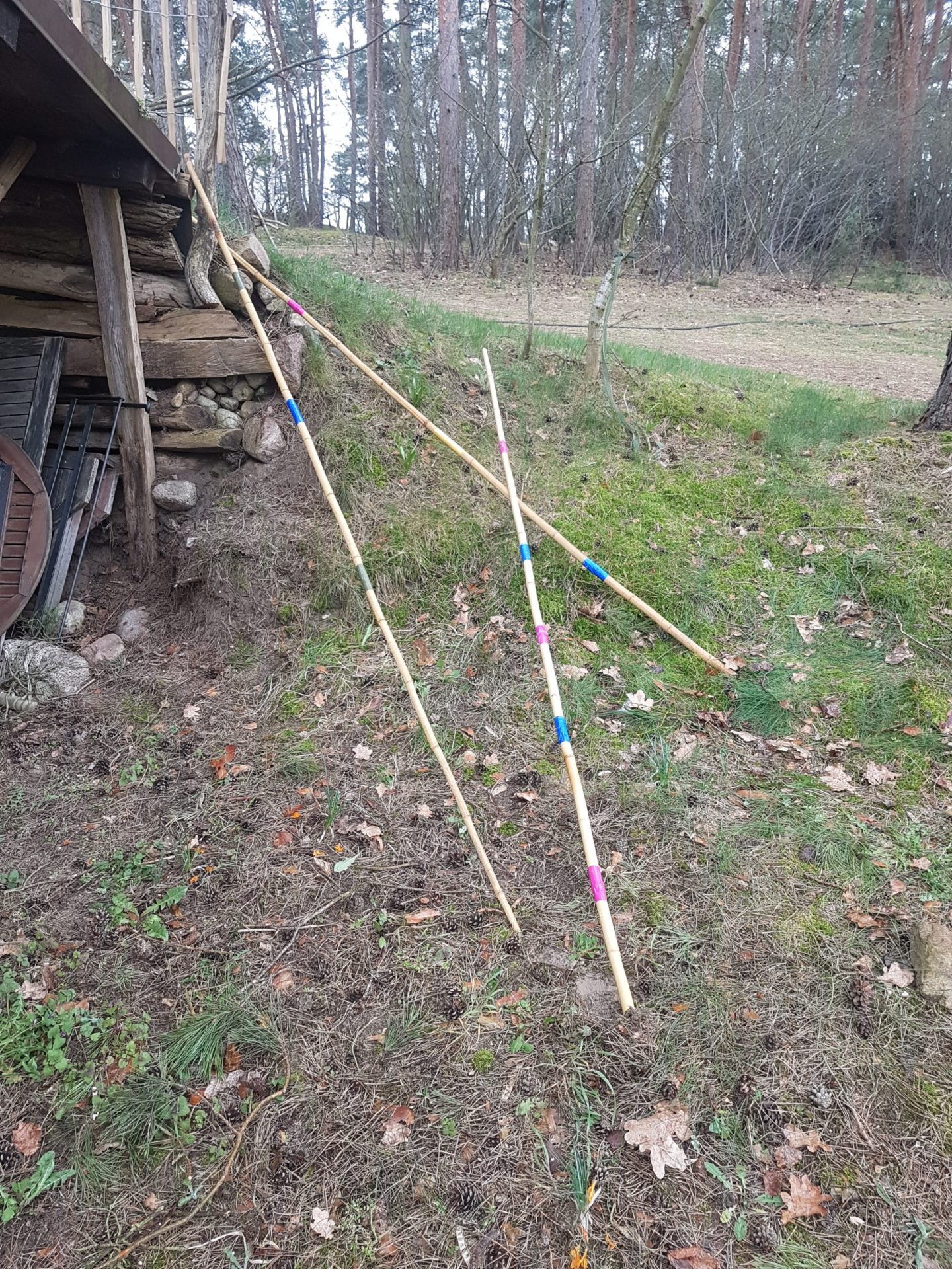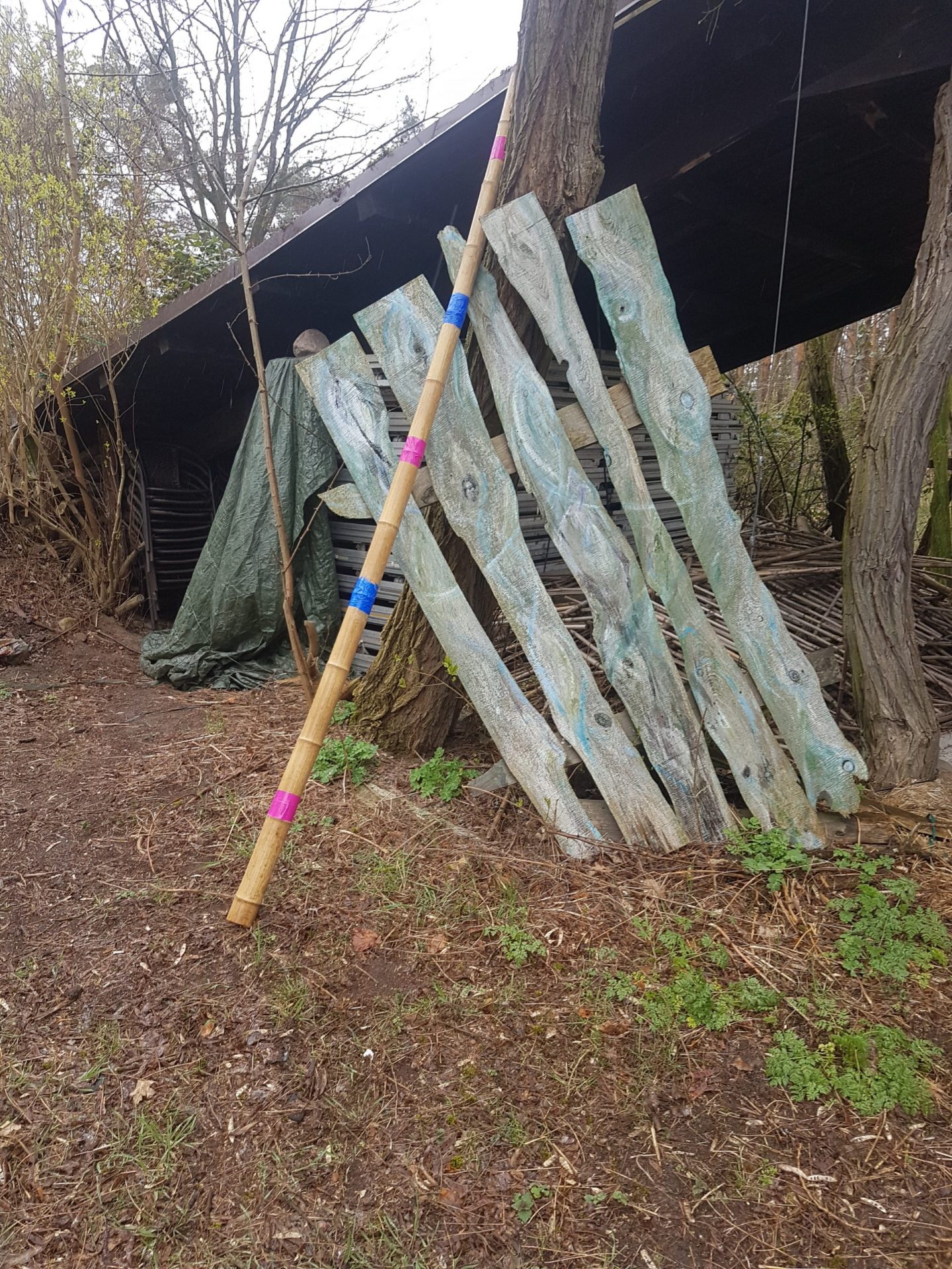 The Berlin artist Ruth Spichtig was mostly inspired by the storm that swept through the forest during her stay at the art residence at Rietzer Berg. The power of nature and the blown over trees that support each other even after having fallen were the model for her "giants pick-a-stick". She built this installation out of bamboo sticks that she painted like pick-a-sticks and distributed on the property of the forest garden. Just as if giants had played with it and then left it thoughtlessly. With a bit of imagination her work can be associated to humanity and current world affairs.