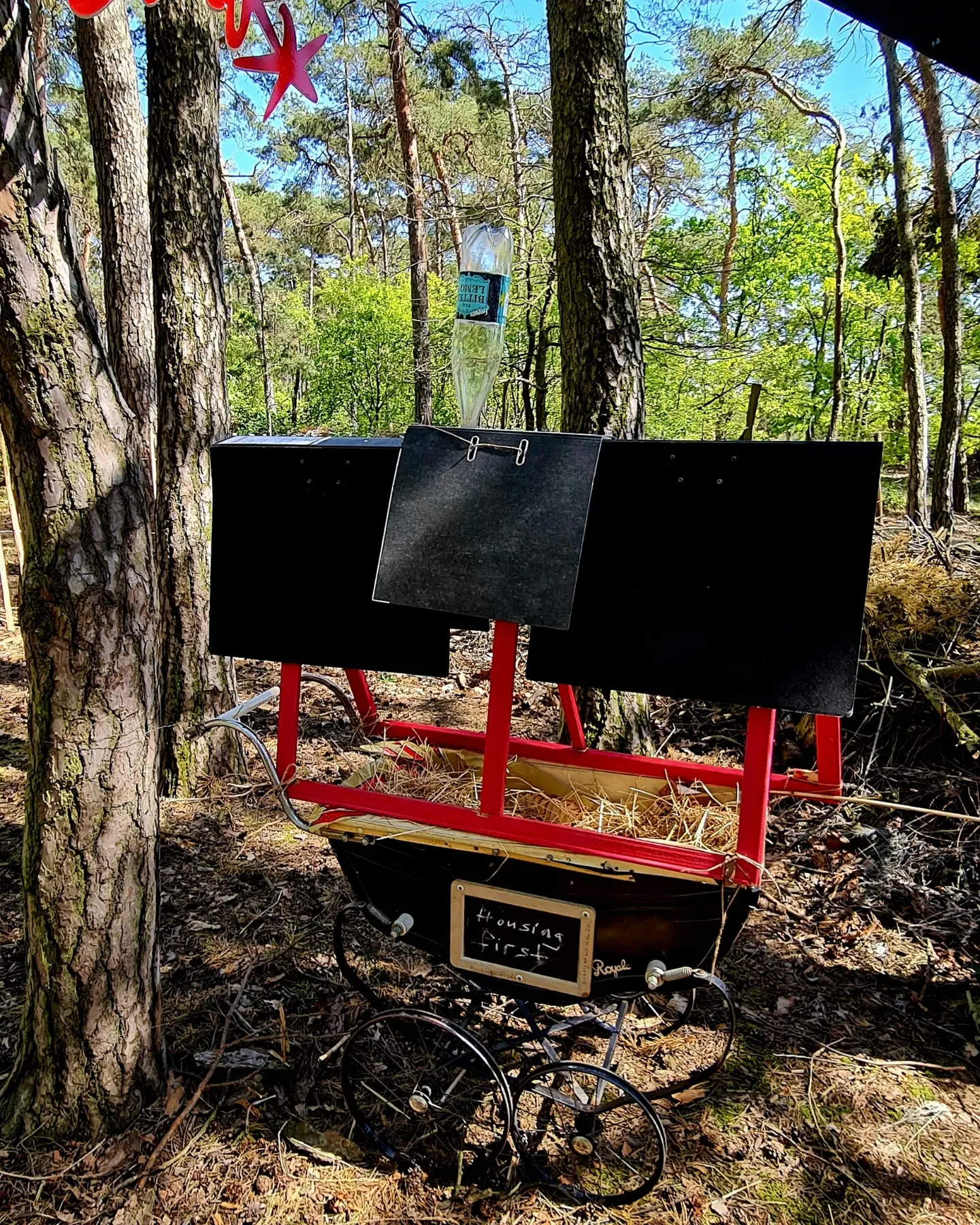 Another installation of the artist is a historic baby pram with document files. Its meaning is that bureaucracy starts even before a person is born and doesn't stop when someone dies. It covers everything and causes us to forget humanity and the really important things in life. That's the reason for the inscription "Housing first" – first of all, the basic needs should be met. A common topic in her art is the statement that humans abolish themselves.