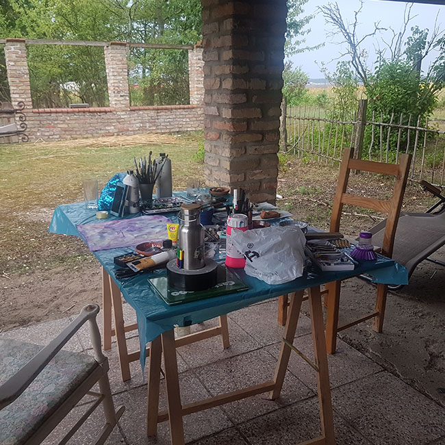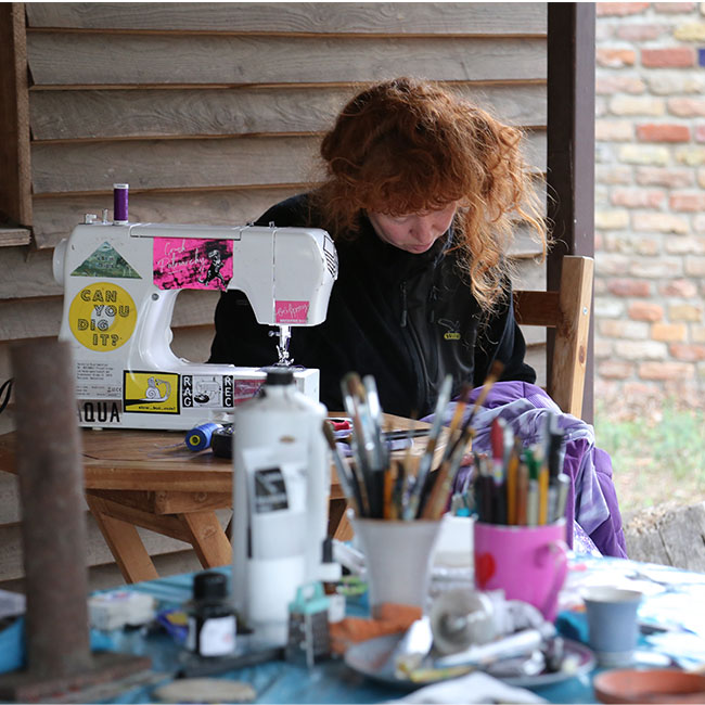 Objectively, the hermitage at Rietzer Berg is rather small. But it's still big enough for three workspaces. In the two-weeks stay of the artist couple Stefanie Müller and Klaus Dietl there was a sound studio inside, a painting studio on the terrace and a sewing shop next to it.