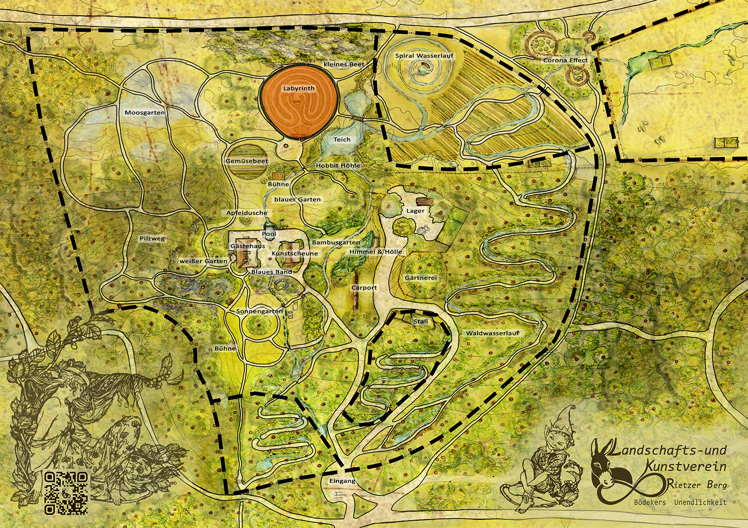 Am unteren Ende des Parks, im Norden des Geländes, befindet sich ein in den dortigen Pflanzenbewuchs eingemähtes Rasenlabyrinth. Diese aus Kreta stammende Form hat seinen Ursprung in der Kultur der Camuni, ein eiszeitliches Alpenvolk aus der Lombardei. Die dort in die Felsen geritzten Zeichnungen werden auf das siebente Jahrtausend vor Christus datiert. Eine Wildhecke bildet seinen Abschluss und natürliche Begrenzung zur freien Landschaft dahinter.